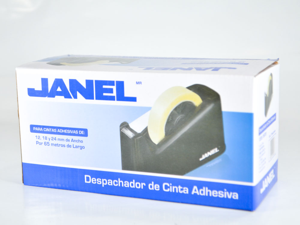 El diseño y peso de los despachadores para tape Janel brindan un fácil uso, posee un corte tipo zigzag. Pueden ser utilizados con cintas adhesivas de anchos 12 mm hasta 24 mm y de largo 33 metros hasta 65 metros.