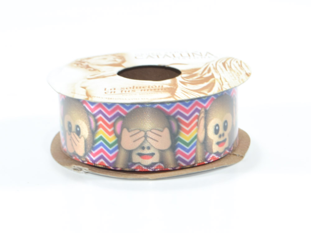 Liston de tela santinado con estampado de monos o emojis, especial para realizar diferentes manualides, regalos o detalles. El rollo tiene logitud de 10 metros.