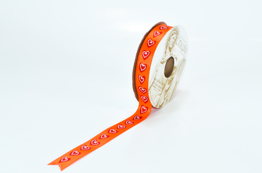 Listón de tela satinado con estampado de corazones, especial para realizar diferentes empaquetes, manualidades o detalles. El rollo tiene longitud 25 metros.