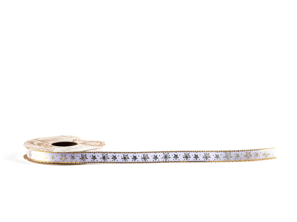 Listón de tela con estampado de estrellas, especial para realizar diferentes empaquetes, manualidades o detalles. El rollo tiene longitud 10 metros.