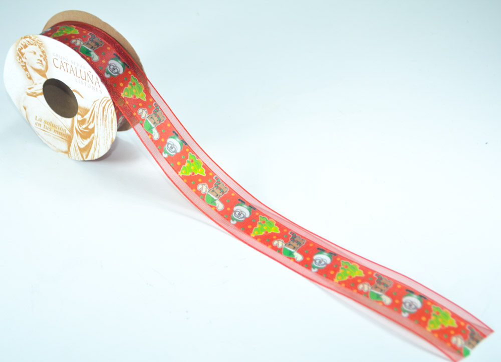 Liston de tela con organza y satín, estampado navideño especial para manualides, moñas, regalos y otros detalles. La longitud del rollo es de 10 metros.