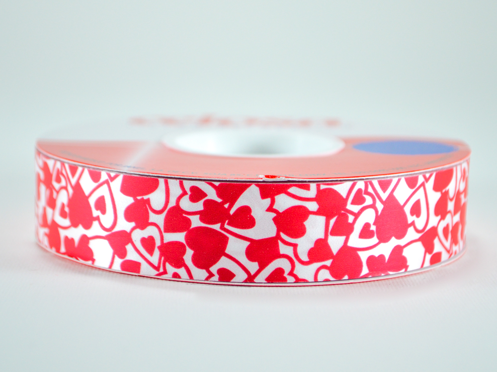 Listón para regalo de polipropileno 100% reciclable con estampado de corazones especial para realizar moñas o empaques. La longitud del rollo es de 50 metros.