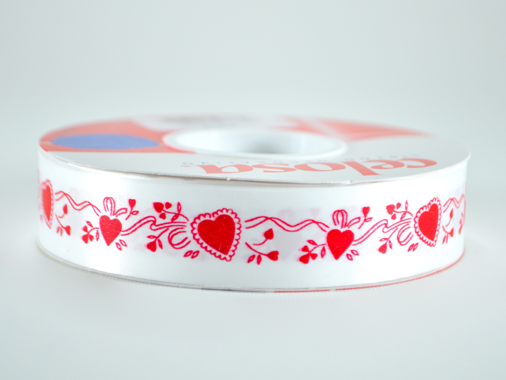 Listón para regalo de polipropileno 100% reciclable con estampado de corazones especial para realizar moñas o empaques. La longitud del rollo es de 40 metros.
