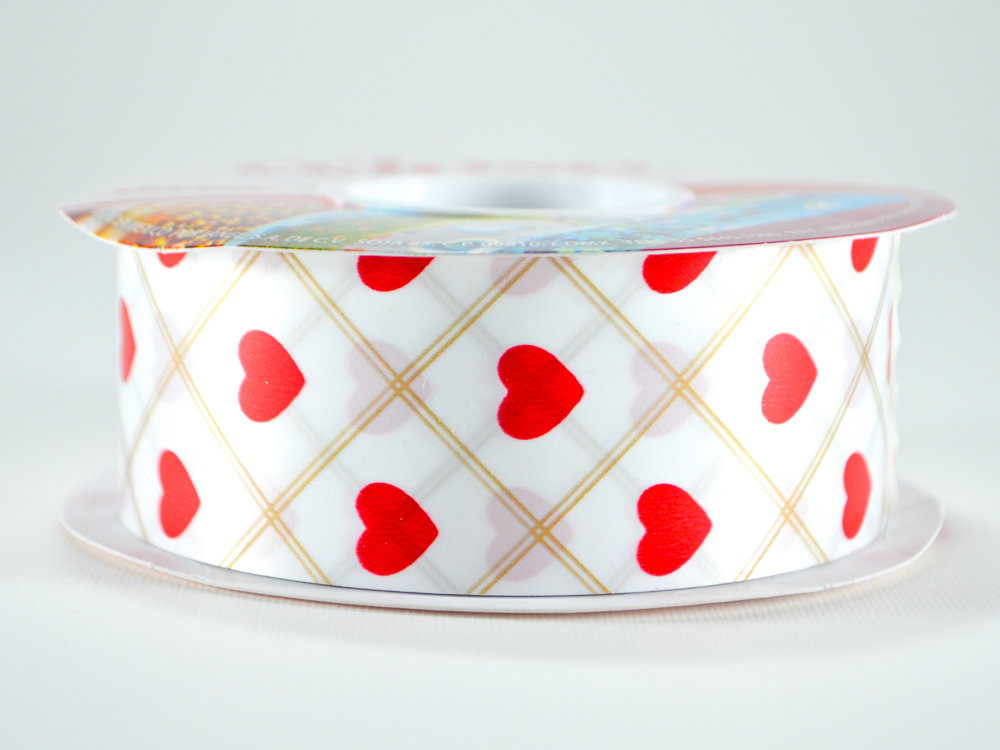 Listón para regalo de polipropileno 100% reciclable con estampado de corazones especial para realizar moñas o empaques. La longitud del rollo es de 40 metros.