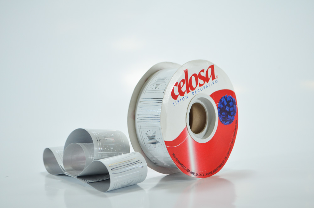 Listón para regalo de polipropileno 100% reciclable con detalles brillantes metálicos especial para realizar moñas o empaques. La longitud del rollo es de 40 metros.