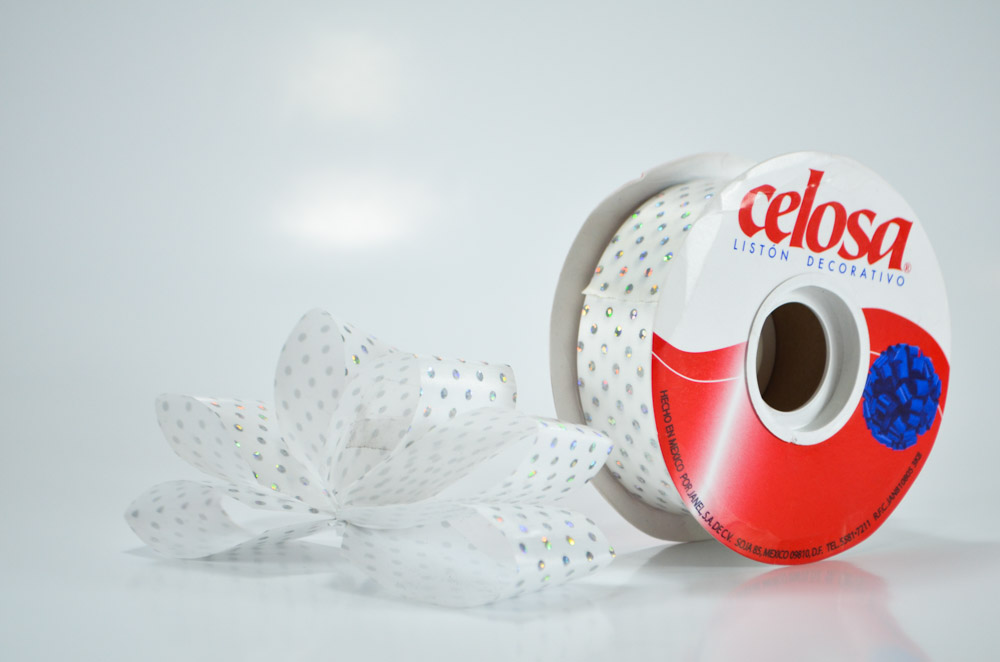 Listón para regalo de polipropileno 100% reciclable con detalles brillantes metálicos especial para realizar moñas o empaques. La longitud del rollo es de 40 metros.