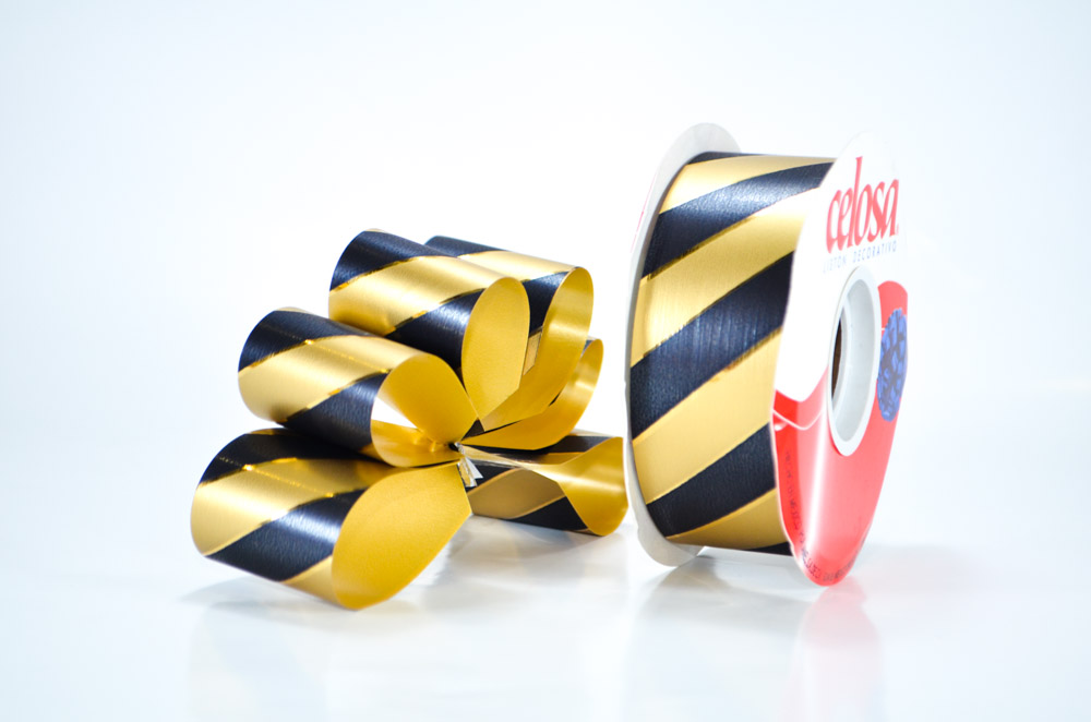 Listón para regalo de polipropileno 100% reciclable con mate detalles brillantes metálicos especial para realizar moñas o empaques. La longitud del rollo es de 40 metros.