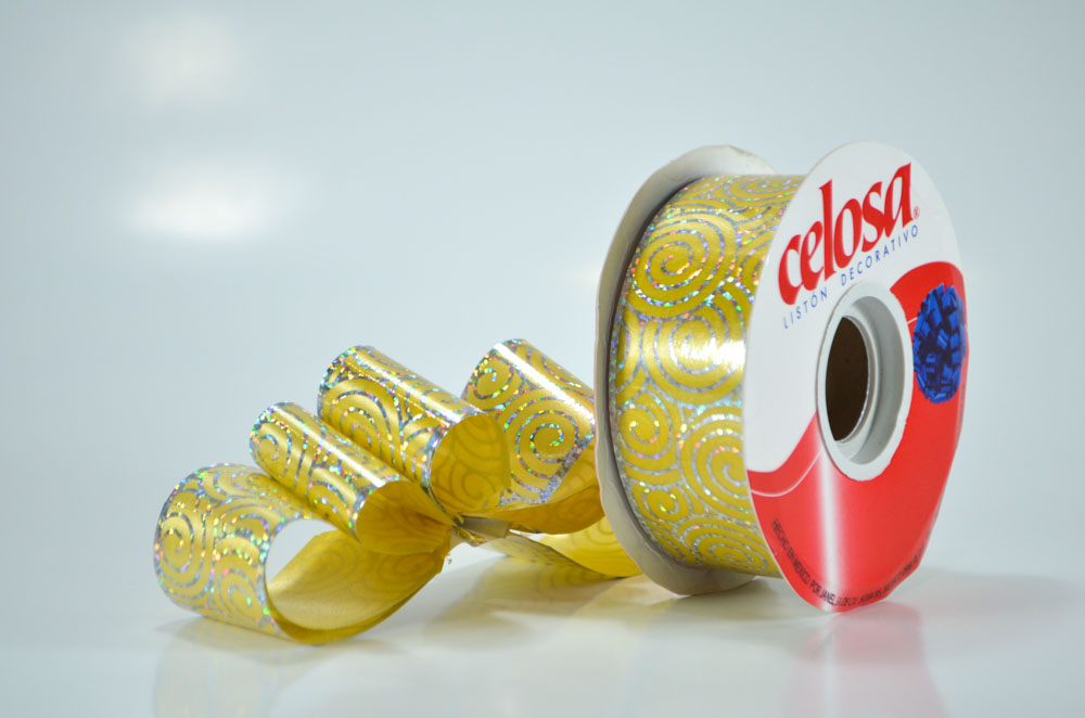 Listón para regalo de polipropileno 100% reciclable con detalles brillantes holográficos especial para realizar moñas o empaques. La longitud del rollo es de 40 metros.