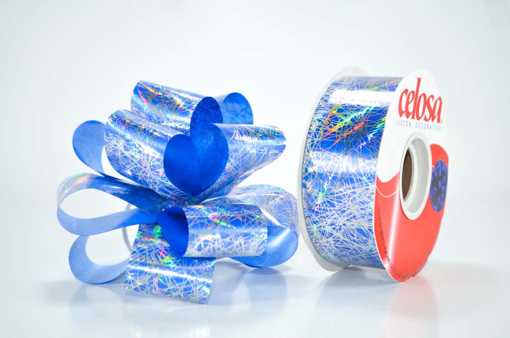 Listón para regalo de polipropileno 100% reciclable con detalles brillantes holográficos y metálicos especial para realizar moñas o empaques. La longitud del rollo es de 40 metros.