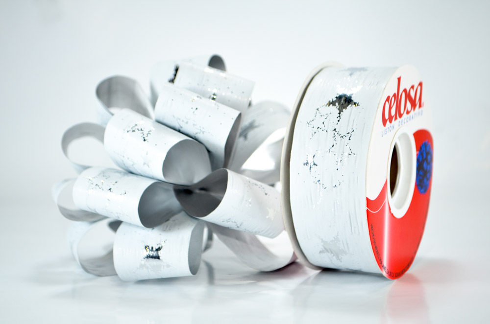 Listón para regalo de polipropileno 100% reciclable con textura mate y detalles metálicos brillantes especial para realizar moñas o empaques. La longitud del rollo es de 40 metros.