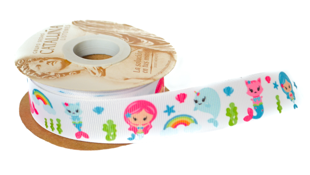 Sumérgete en la magia del océano con nuestro listón de tela con diseño de sirenas y acabado de poporillo. Perfecto para la elaboración de manualidades y detalles especiales, este listón añade un toque encantador y fantástico a tus proyectos creativos.