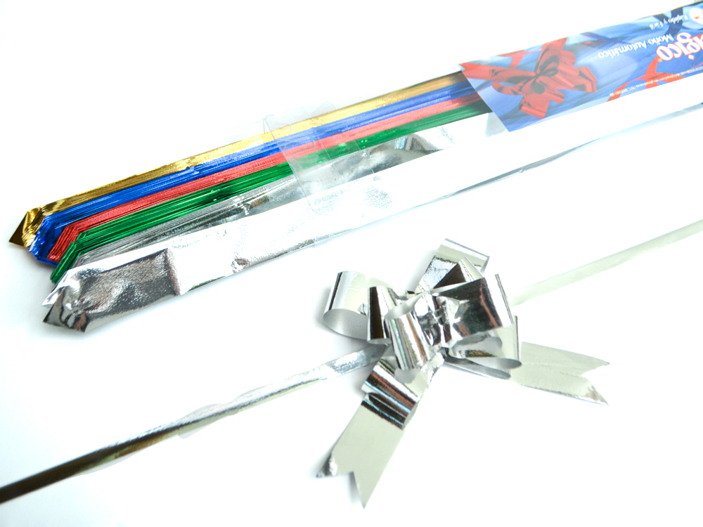 Caja con 50 moñas de un color y tamaño. Moñas de polipropileno 100% reciclable diseño metálico brillante son prácticas, sencillas y listas para dar brillo en toda ocasión y en cualquier detalle.
